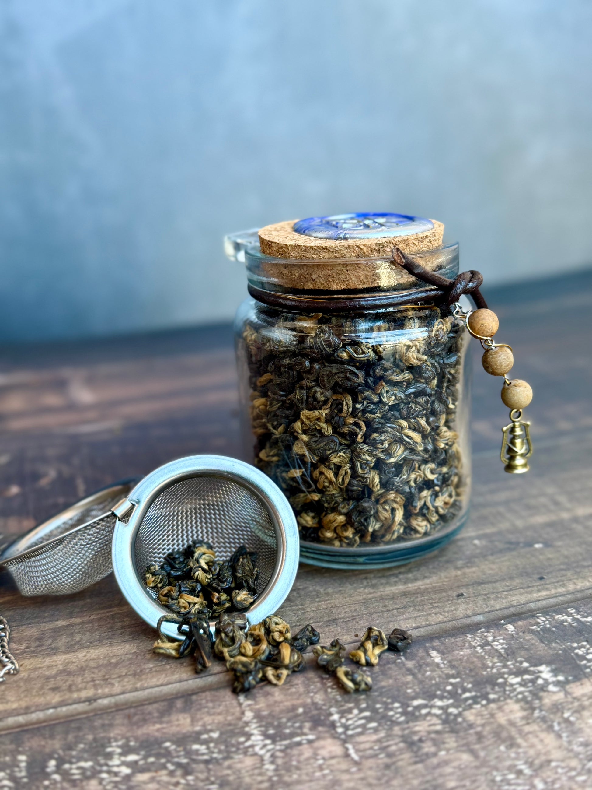 The Ore’s Appearance ( a specific Yunnan Black) is meticulously processed to capture the essence of its namesake. The leaves are carefully rolled into dark, hammered nuggets—dense, formidable pieces of "ore" that evoke stone mined from a deep mountain cavern. These dark nuggets are naturally striated with shimmering silver-white veins (the young, downy tips of the tea buds), perfectly mimicking the legendary mythological metal known for its unparalleled strength and luminous purity.
